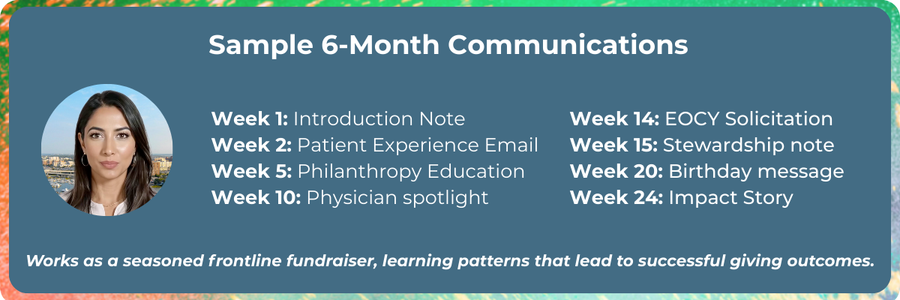 Virtual Engagement Officers manage portfolios of 1,000 prospects with a similar moves management approach that human gift officers deploy. They learn about the prospect, share relevant opportunities to show gratitude through philanthropy, and build connections between the patient prospect and the work of the healthcare organization over time. Instead of a single touchpoint, VEOs execute strategic, multi-touchpoint cultivation that gives each donor a welcome avenue to engage.